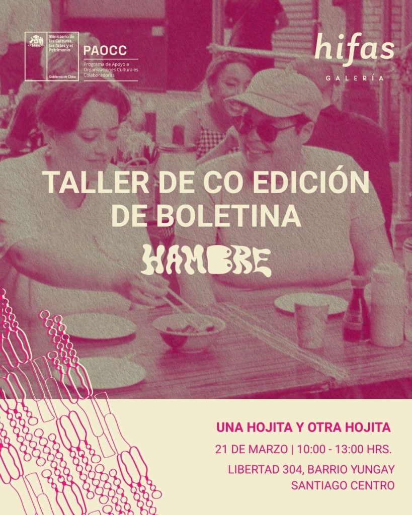 Acompáñanos este sábado 21 de marzo, de 10:00 a 13:00, en Galería Hifas para coeditar el segundo número de Una Hojita. Un espacio de edición artesanal, guiado por la editorial HAMBRE, para crear y colaborar en la próxima boletina feminista que, luego, será duplicada en risografía a dos colores y distribuida gratuitamente durante la exposición “Nuestro papel en el arte”.