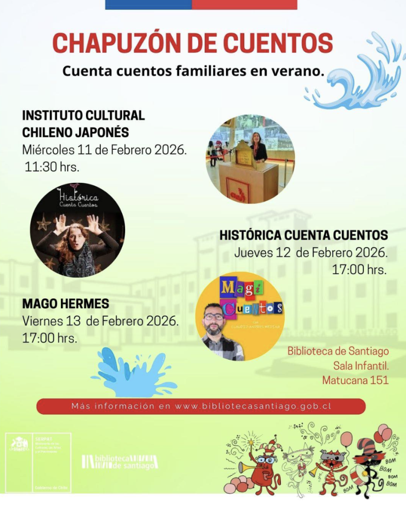 No te pierdas los panoramas que la próxima semana tenemos para las familias en la Biblioteca de Santiago 😉 Anota que de miércoles a viernes armamos cuentos para disfrutar en verano con diferentes amigas/os y en distintos formatos.