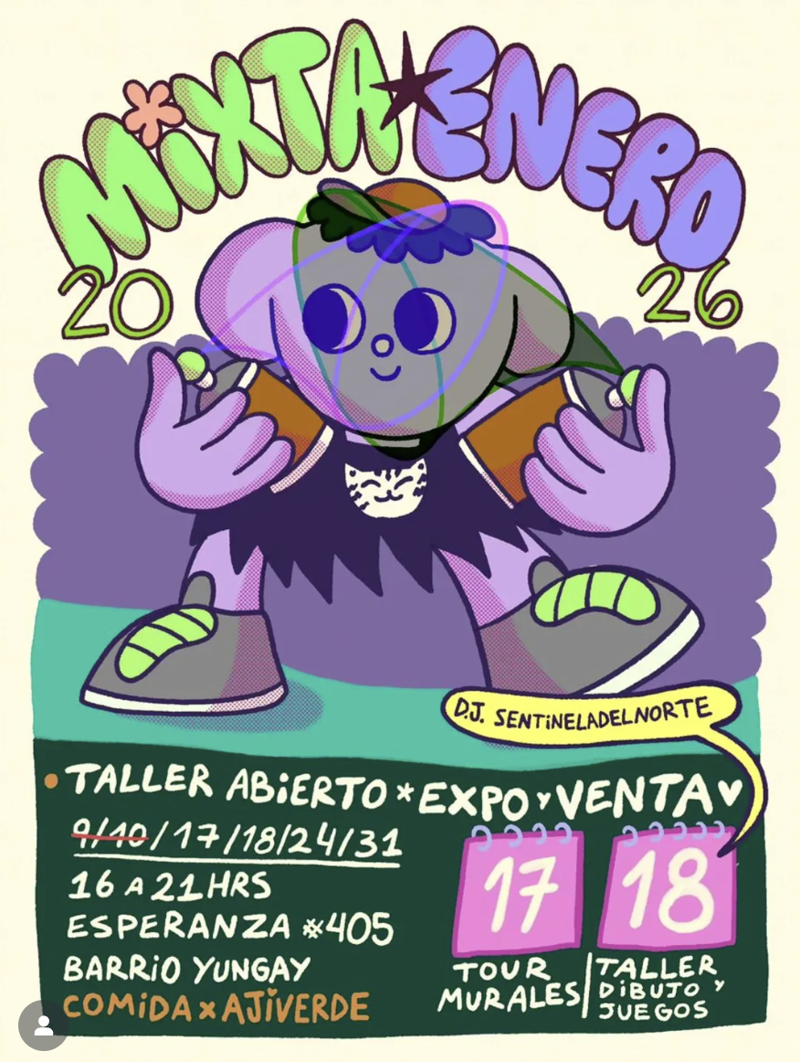 Este mes nos juntamos todos los sábados y domingos de enero en Esperanza 405, Barrio Yungay, para compartir talleres abiertos, expo, venta y más.