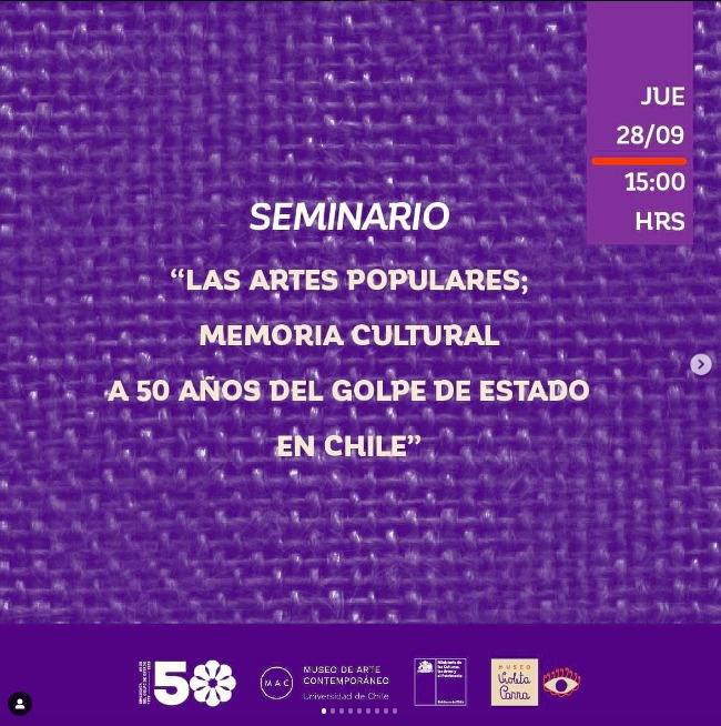 Con motivo de la conmemoración de los 50 años del Golpe de Estado, el Museo Violeta Parra y el Museo de Arte Contemporáneo MAC (@museo_mac) los y las invitan a participar del Seminario “Las artes populares; memoria cultural a 50 años del golpe de Estado en Chile”, el cual propone contribuir al diálogo y la reflexión en torno a las artes populares relevando la memoria cultural e histórica.