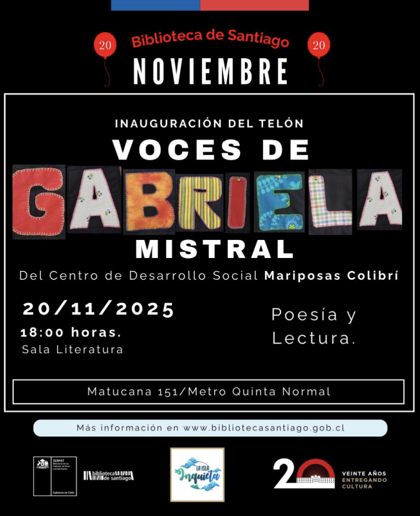 Te invitamos a la inauguración del Telón Voces de Gabriela Mistral, de las integrantes del Centro de Desarrollo Social “Arpilleristas Mariposas Colibrí” de la comuna de La Granja.